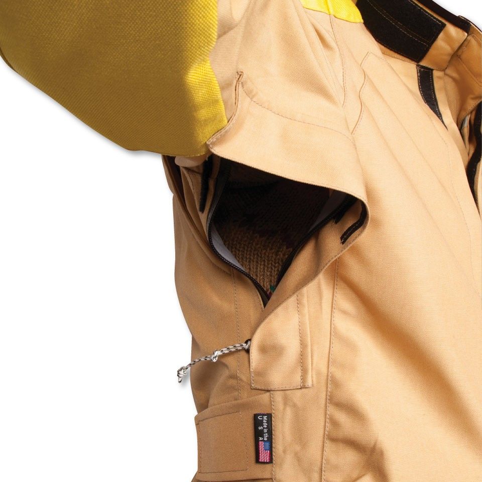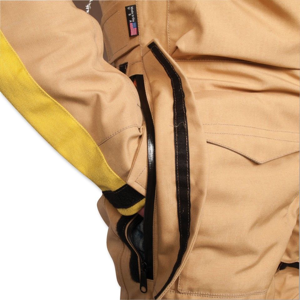 Three standard body colors: black, grey, tan, and hi-viz lime yellow. Six standard abrasion area colors: black, grey, hi-viz lime yellow, cobalt blue, red, or pink. Machine washable. Men’s sizes 34 regular, 36–54 short, regular, or long. Women’s sizes 2-20 short, regular, or long. Choose TF3 or TF6 armor. Made in America