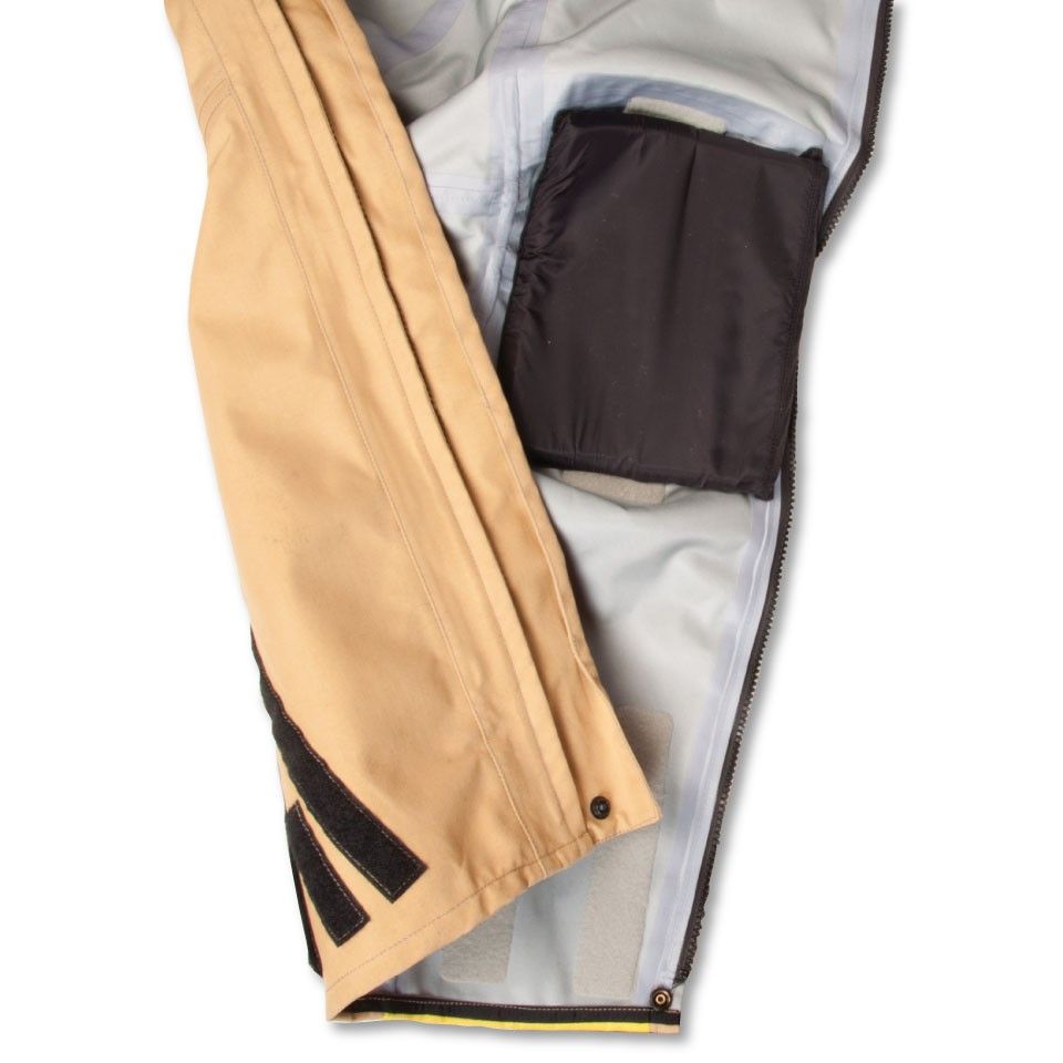 Additional features include flap-covered hip-side water-resistant zippers for fast access to your street pants, a hidden pass-thru port for an electric liner power cord, nine strategically placed everyday-useful pockets, a mini-carabiner helmet holder at the upper chest pocket, a highly water-resistant inner wallet/phone/iPod pocket, fit-adjustable ankle and wrist tabs, articulated knees, fit-adjustable waist tabs and an integrated stretch panel across the lower back. There are also oversized 3M Scotchlite® reflective areas across the back, chest, and ankles to enhance conspicuity in low-light conditions.