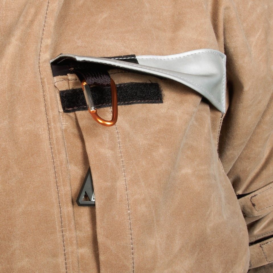 Falstaff collar detailFor example, imported waxed cotton gear often uses a small belt-buckle to cinch the collar. This may be historically accurate styling, but isn’t possible to manipulate those little buckles surely and quickly if you actually depend on your gear for all-weather situations. A Falstaff accomplishes it with a classic collar strap design, fitted with hook-and-loop, so it’s fast and easy to adjust the jacket’s collar on-the-go. Practical improvements like this are what helped Falstaff gear become a hand-crafted sewn-in-the USA classic.