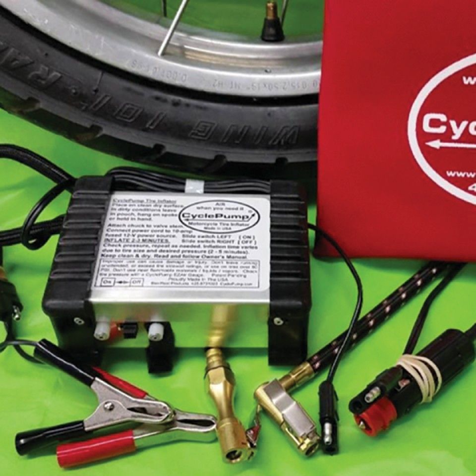 Contained in a sturdy aircraft-grade aluminum case with rubber armored end-caps, this 12V pump inflates a motorcycle tire from flat in about 2 minutes. Pumps to over 100 PSI if needed. Fold-out legs increase stability and keep the unit out of the dirt. Choose either a straight or 90º clip-on locking air chuck. A 24" air hose and 8' power cord give plenty of reach. Add an optional 8' Autocord Extension for even more. Plugs in to any 12V SAE connection, via the included universal BMW/cigarette-socket power plug, or battery alligator clips. Everything fits compactly in a rugged storage pouch. 2"×4"×6" and 36 oz. 10A.